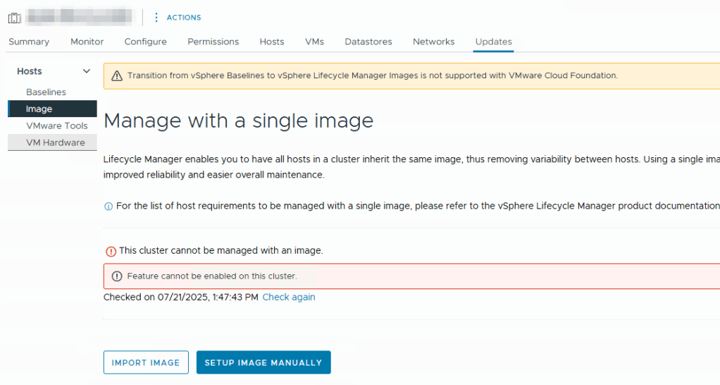 converting an existing cluster from using baselines to vLCM image fails with the following error message(s):