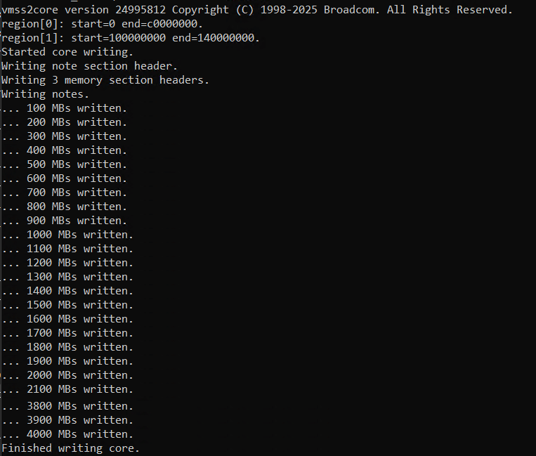 if you ever need to create a memory dump of a virtual machine running on an ESXi host, vmss2core is an easy-to-use tool that can convert snapshot files to a core dump file.