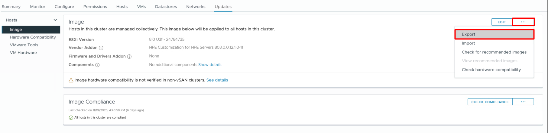 you can perform this operation on any existing cluster that is set up for image patching, or you could create a dummy cluster in vCenter to create your image. in my case I already had a cluster with the ESXi version and vendor addon version I needed.