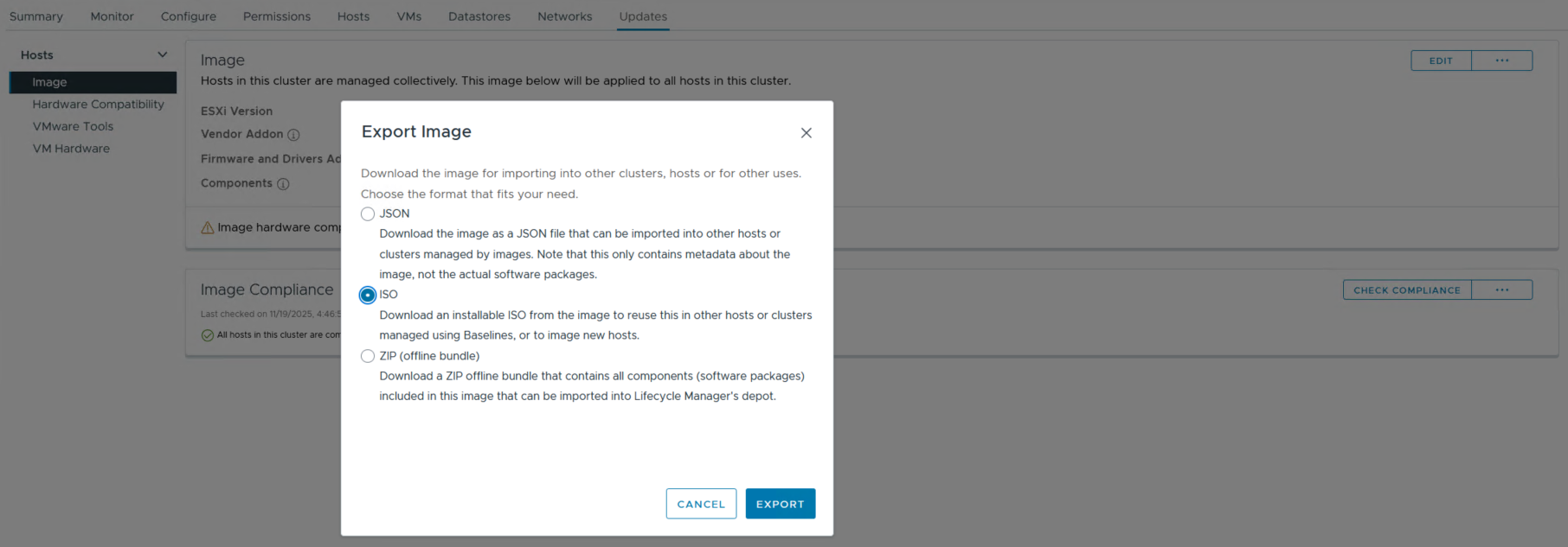 exporting a custom image from vCenter is fairly simple, and you have the option to export as ISO, ZIP og JSON.